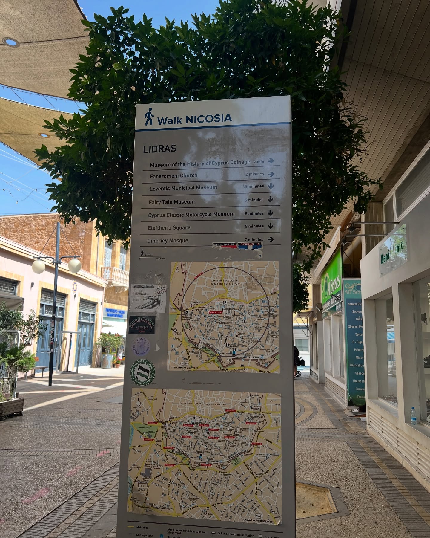 изградени од Франките и опфатиле многу поголема површина од 16-те венецијански ѕидини кои сè уште го опкружуваат стариот град. Кога Венецијанците го окупирале Кипар, тие решиле да ги урнат Франките ѕидини бидејќи тие биле стари и не нуделе соодветна одбрана од новото оружје како артилерија. Франките ѕидини биле исто така преголеми за да бидат управувани од венецијанската војска и премногу блиску до ридовите на исток и југоисток од градот. Формирајќи круг, ѕидовите изградени од Венецијанците биле зајакнати со единаесет бастиони во облик на срце и заштитени со ров широк 80 метри. Изградени се од кал – тули, а долниот дел е само поткрепен со камен. Кога Османлиите ја окупирале Никозија, ги поправале ѕидовите и го покриле горниот дел со камења. Потоа со автобус се симнуваме близу Ледра улицата и продолжуваме повторно пеш. Laiki Geithonia -е традиционална населба во градските ѕидини. Куќите се обновени за да потсетуваат на традиционалната, стара Никозија. Тоа е пешачка зона со градби од 18 век и комбинација од станбени куќи, уметнички продавници и таверни. Ledra Street – Улицата Ледра е главната шопинг улица во Никозија. Не е особено живописна, но е позабележителна по својата историја отколку по изгледот. Улицата стана озлогласена во 1950-тите по кипарските националистички напади врз британската војска и го доби прекарот „Убиство на Милија“. Улицата беше целосно затворена – заѕидана – на границата по инвазијата на Турција во 1983 година. Границата е повторно отворена дури во април 2008 година. Peace Sign – е поставен симбол што ја симболизира надежта за мир во кипарскиот спор меѓу Република Кипар и Турската Република Северен Кипар. Crossing the Green Line – Преминувањето граница пешки во Никозија помеѓу Грчки и Турски дел е едно од најдобрите искуства што ќе ги направите. Веднаш се чувствувате како да сте во друга земја и со различна временска зона. -Büyük Han- Изграден во 1572 година од страна на Османлиите, Бујук Хан е карвансарај каде патниците и трговците можеле да се одморат. Тоа е голема, квадратна, двокатна зграда со централен двор; традиционално приземјето би се користело за трговија, а горниот кат за сместување. Во центарот на дворот има мала купола џамија каде патниците можеле да се молат. Büyük Han бил обновен во текот на 1990-тите, а посетителите денес можат да уживаат во пијалок или храна во рестораните во дворот, исто како што можеле гладните патници пред 400 години. Горе ќе најдете широк спектар на занаетчиски продавници кои продаваат интересни сувенири. – завршуваме турски дел. Selimiye Mosque – Најинтересното место за гледање во делот на Никозија на кипарските Турци е џамијата Селимије. Ако сте запознаени со готските катедрали и цркви во западна и централна Европа, тогаш џамијата Селимије е многу збунувачка глетка – типично готски сводови и столбови кои сугерираат распоред сличен на катедралата. Тоа е затоа што оваа џамија првично била римокатоличка катедрала – катедралата Света Софија. Камен-темелникот бил поставен во 1206 година, но земјотресите ја спречиле изградбата и таа била осветена како христијанска црква до 1326 година – дури и тогаш, зградата не била целосно завршена. Понатамошните земјотреси во следните два века предизвикаа поголема штета. Во 1570 година, Османлиите ја опколија Никозија. Кога градот конечно падна по 50 дена, катедралата беше официјално претвор