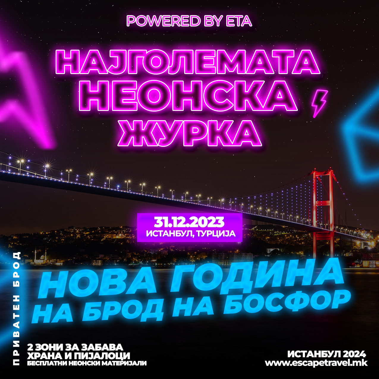 Ова година нашата забава ја збогатуваме со НЕОНСКА ТЕМАТИКА, каде секој гостин на бродот добива бесплатни неонски материјали за да доловиме вистинската сеонзација на неонската магија. Нашиот брод ќе биде детално уреден со неонски светла кои ни приредат вистинско шоу!