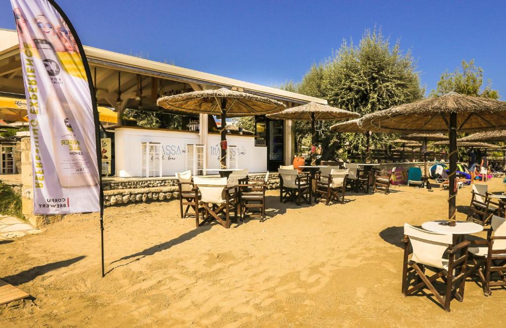 Aparthotel Robolla Beach им овозможува на своите гости директен пристап до прекрасната песочна плажа веднаш пред самиот хотел. Освежителниот морски ветар на Јонското Море и топлото медитеранско сонце ќе ви го направат вашиот престој релаксиран. Морето е погодно и за деца бидејќи е плитко неколку метри. Во исто време, на плажа гостите на Robolla Beach Aparthotel можат да уживаат во лежалките и чадорите што ги нуди хотелот потполно бесплатно. Последно, но не и најмалку важно, Thalassa – Beach Bar нуди коктели и разни пијалици за секого.