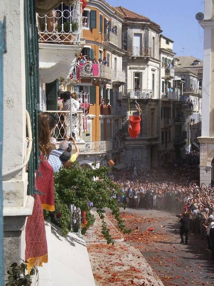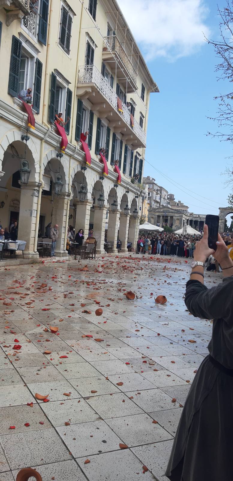 Точно во 11:00 часот, црковните ѕвона го означуваат „утринското воскресение“ и од прозорците на куќите почнуваат да се фрлаат глинени садови полни со вода, во знак на почнување на празникот и истерување на злото. Ова потекнува од стар венецијански обичај со кој за дочекот на новата година се ослободувале старите работи да направат простор за нови и подобри. Друго објаснување за овој обичај е дека има паганско потекло и дека со вревата направена од кршењето, Античките Грци сакале да ја разбудат Персефона, божицата на пролетта и да го забрзаат нејзиното доаѓање. Обичајот е да се земе парче од скршените глинени садови и да се сочува за среќа и здравје до следната година. Филхармонските групи се враќаат на улиците и почнуваат да свират весела музика.