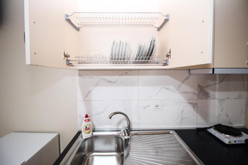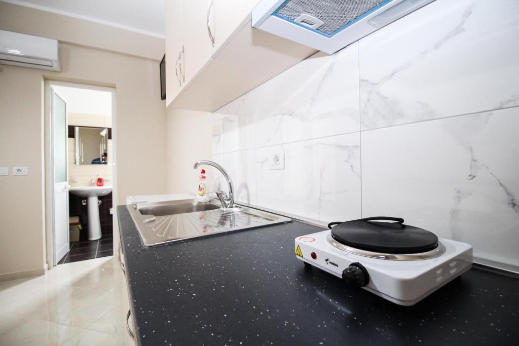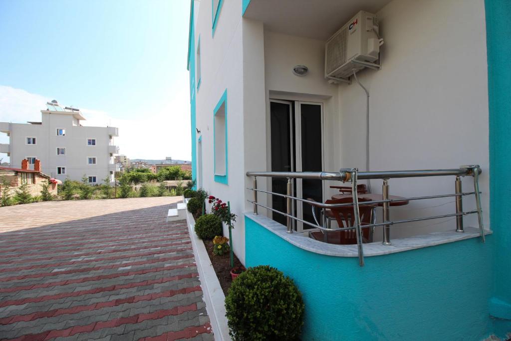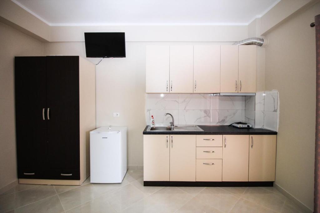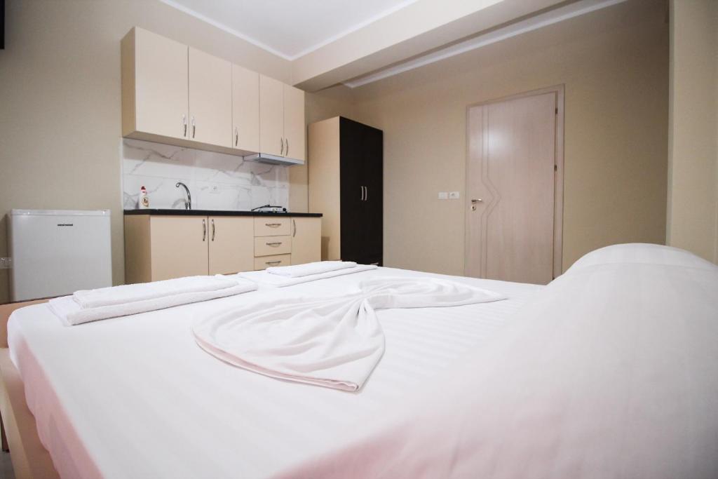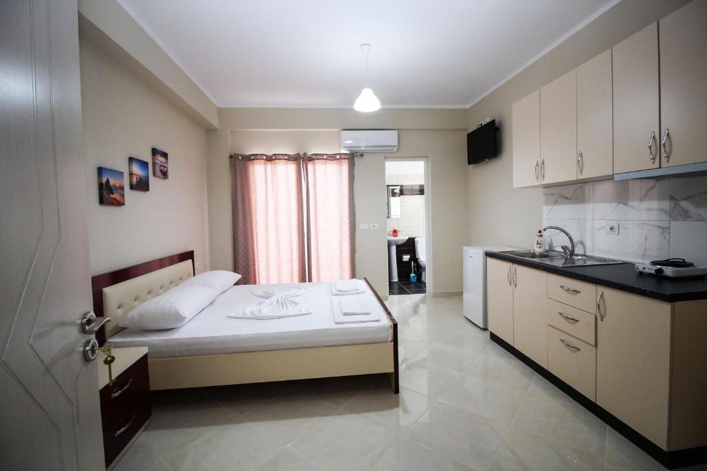 • Студиото е 18м2, има голем брачен кревет, балкон, поглед на градината, комплетно опремена кујна со прибор за готвење и јадење, фрижидер, клима (вклучена во цената) сопствено купатило, бесплатен интернет во собата и во цела вила.