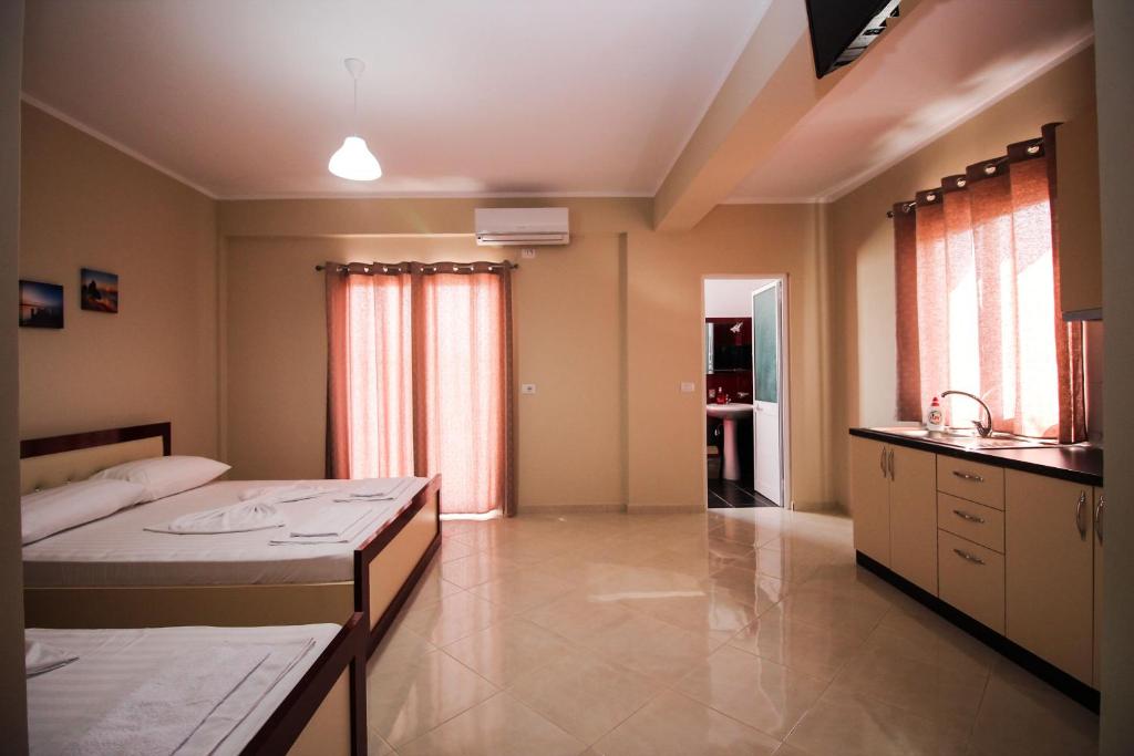 • Студиото е 22м2, има голем брачен кревет + единечен кревет, балкон, поглед на градината, комплетно опремена кујна со прибор за готвење и јадење, фрижидер, клима (вклучена во цената) сопствено купатило, бесплатен интернет во собата и во цела вила.