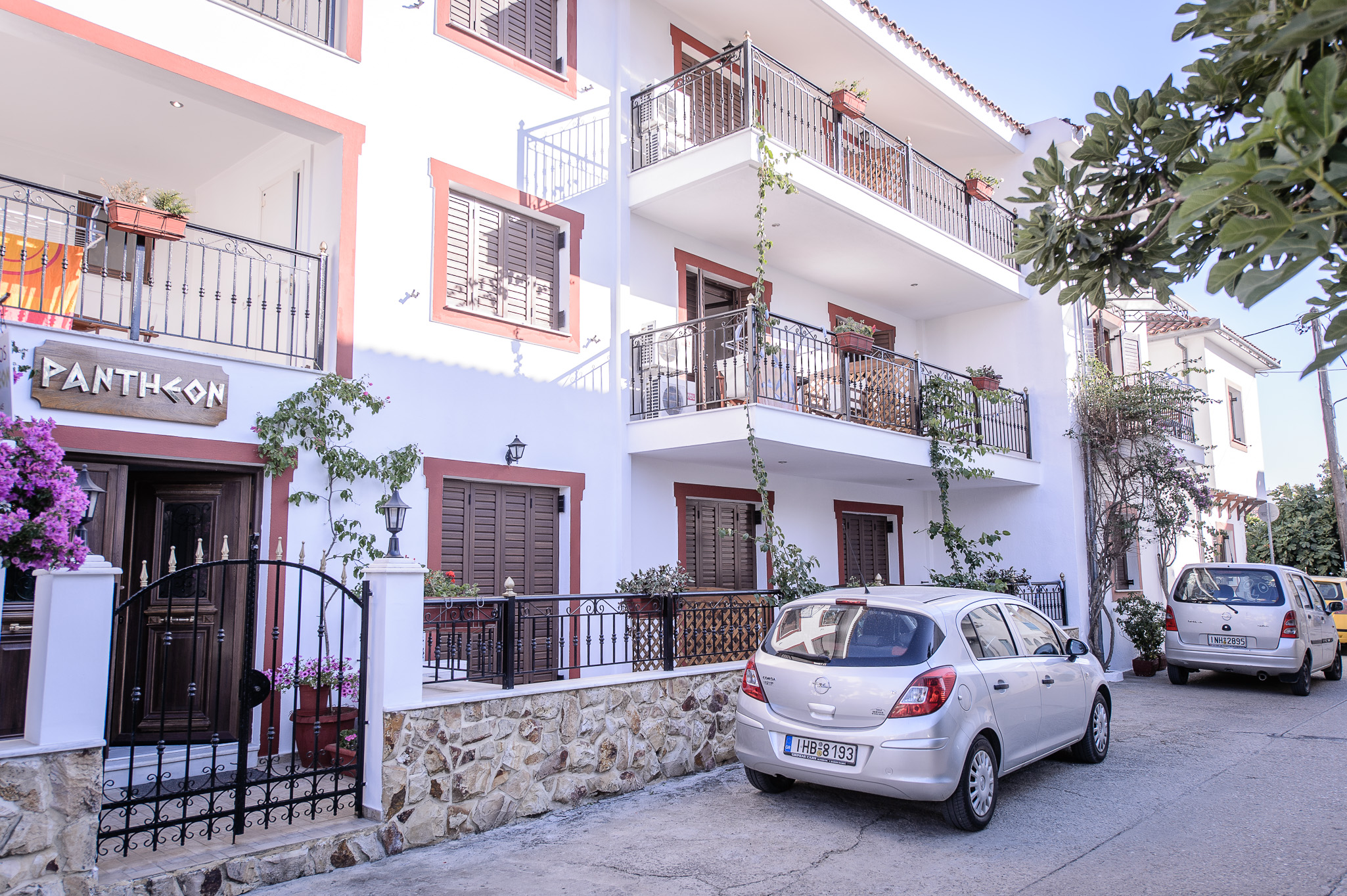 Вилата Пантеон располага со студија за две и три лица. Сите студија имаат комплетно опремена кујна, купатило, тераса, клима-уред, Wi-Fi и телевизор. Вилата се наоѓа на главната улица „Пападијаманти“ (Papadiamanti) во градот Скијатос. На 400 метри оддалечена од првата градска плажа „Мегалијамос“ (Megaliammos).