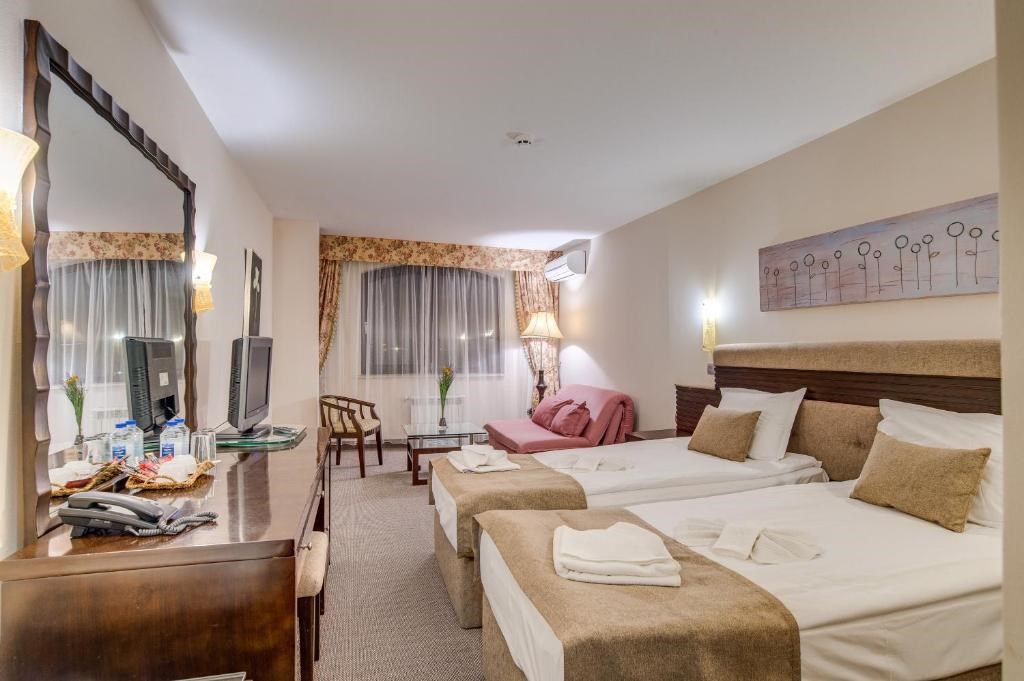 74 двокреветни соби – Сите двокреветни соби во Банско СПА имаат простор за седење, софа кревети (единечни и двокреветни), ТВ, Wi-Fi или LAN конекција. Во секоја бања ќе најдете када со туш и тоалети и додатоци.